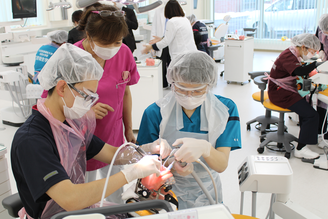 実習では、「歯科衛生士(術者)」、「診療補助者」、「患者」役の3人組で、歯科用チェアーユニットを用いた相互実習を行います。
