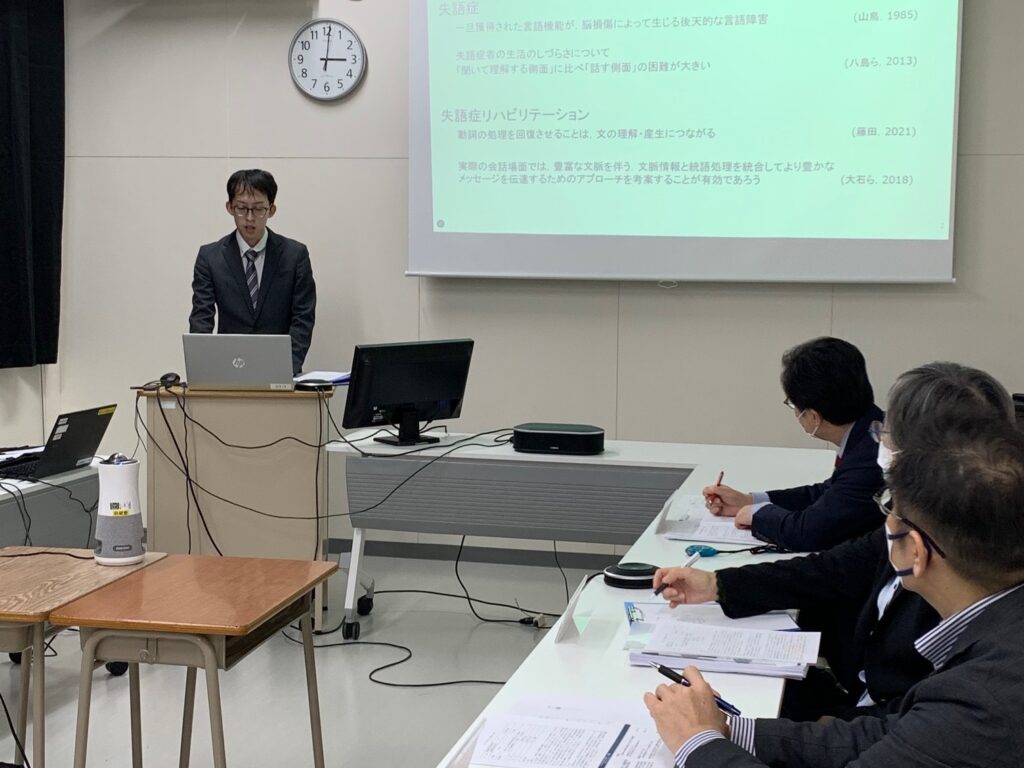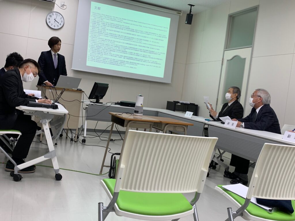 当日は、同研究科地域健康支援学専攻2年生5名が、研究成果の要旨と発表用スライドを用いて発表を行いました。各発表は、発表時間20分、口頭試問20分の計40分で実施され、主査1名、副査2名による厳正な審査が行われました。