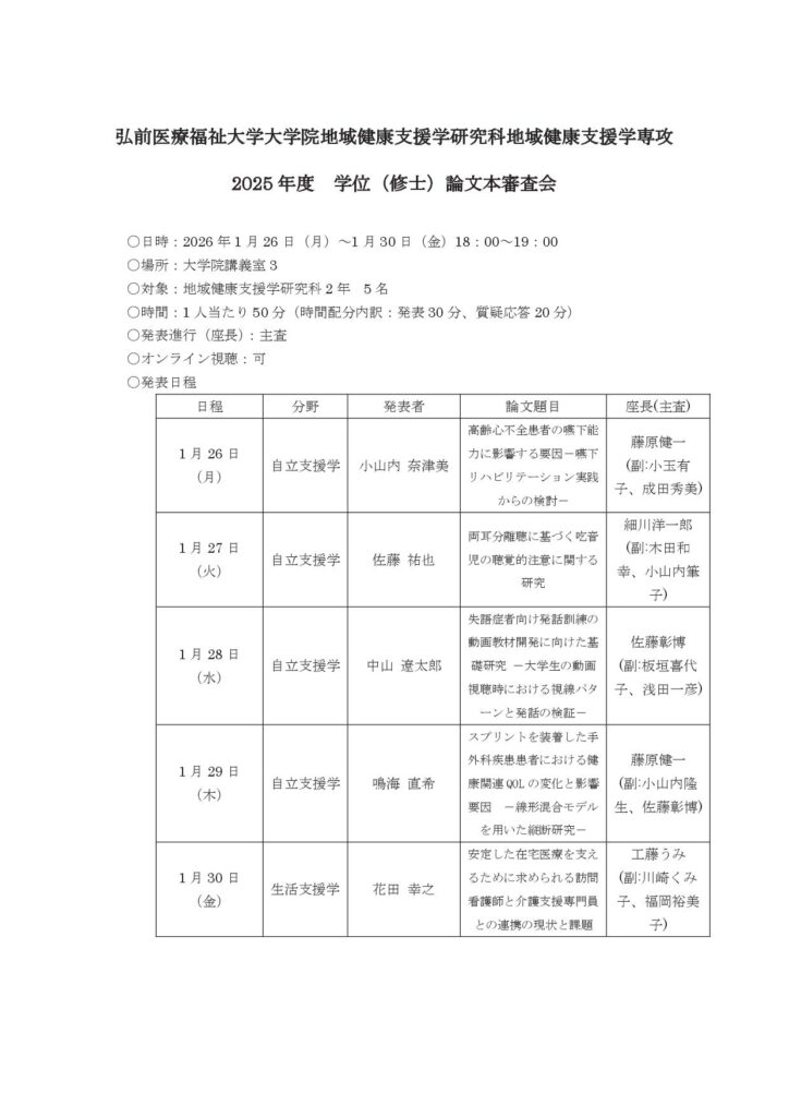 弘前医療福祉大学大学院 地域健康支援学研究科地域健康支援学専攻では、
