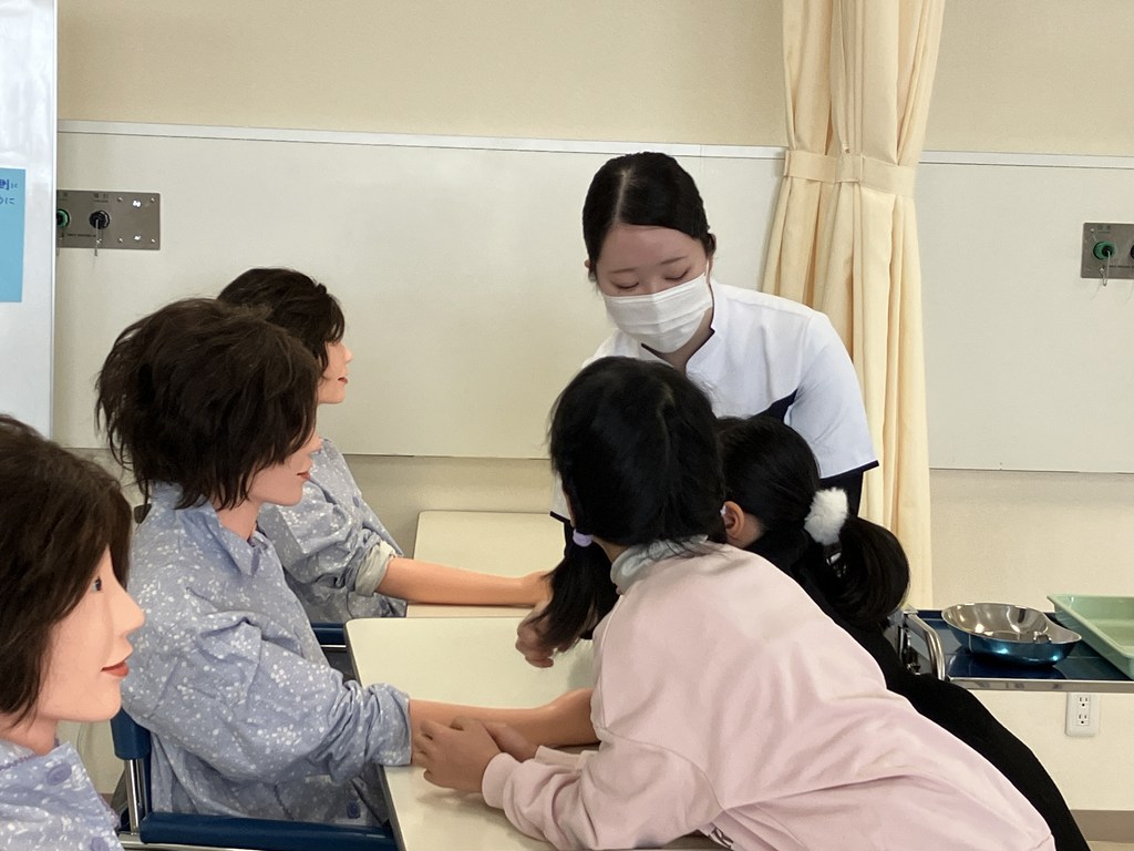 当日は、専門的な設備を活用した体験学習と、体を動かすレクリエーションの二部構成で行いました。看護師体験では、学生から身体の仕組みや看護技術のレクチャーを受けながら、「正しい手洗い」「皮膚の消毒」「脈拍測定」に挑戦しました。